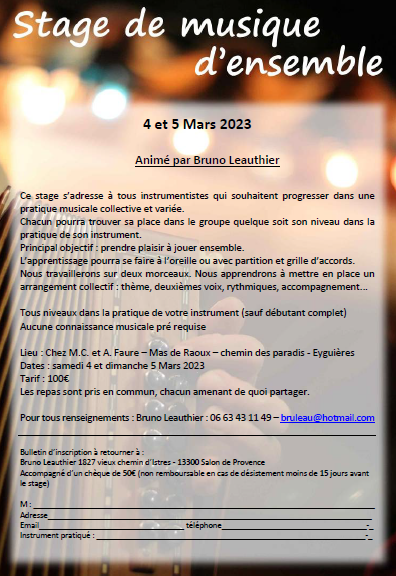 - du 17 au 21 août : stage musique d'ensemble, tous niveaux (sauf débutants - tous instruments), animé par Bruno LEAUTHIER)