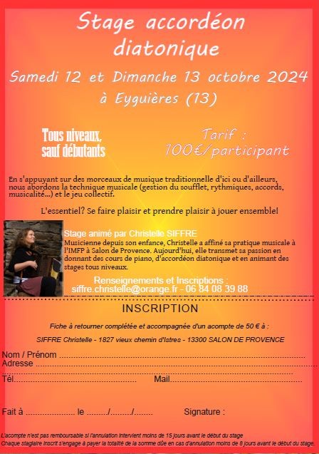 - du 12 au 14 août : stage accordéon diatonique pour les débutants, animé par Christelle SIFFRE