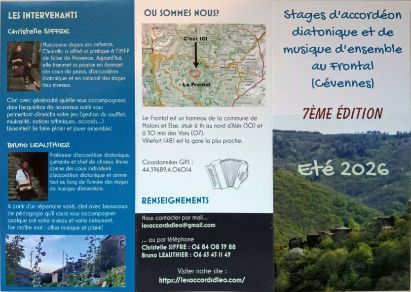 - du 13 au 17 juillet : stage accordéon diatonique tous niveaux (sauf débutants), animé par Christelle SIFFRE