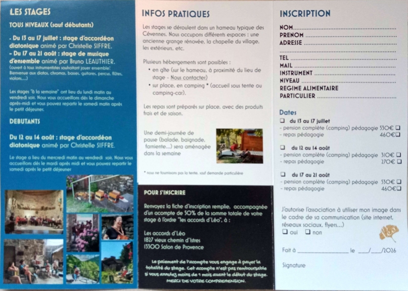 - du 12 au 14 août : stage accordéon diatonique pour les débutants, animé par Christelle SIFFRE